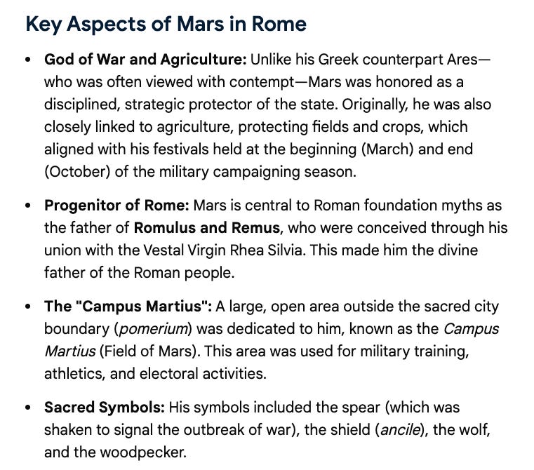 Classical Greek religion then marginalized and almost outlawed Ares, almost certainly because he was associated with martial, ecstatic frenzy and their entire religious reform effort was oriented around doing away with that sort of thing. Rome, in contrast, held Mars in great esteem and the Greeks in contempt for having sidelined their warrior deity in favor of Philosophical pedophile nonsense.
