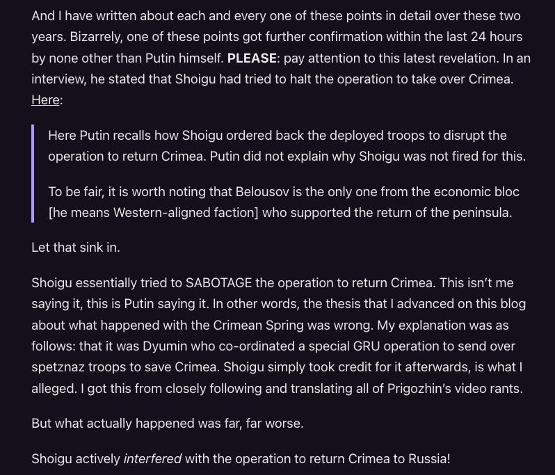 But the real wildcard is Crimea. For some reason, the Kremlin really wants to hold on to Crimea. Donbass, not so much. I believe that Crimea is the big sticking point in the negotiations. Kiev and NATO want it back and to build bases on it. Moscow, to their credit, does not feel comfortable with it. If you are interested in the inside story of how Crimea was taken back and behind Shoigu’s back, I’ve got your back on that. Here:
