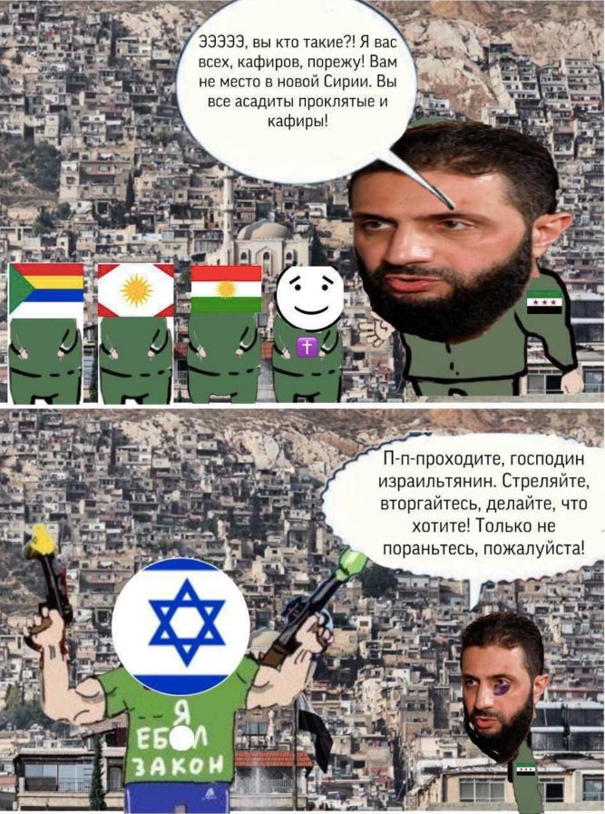 We know that Jolani was put into power with the help of Tel-Aviv, Washington and Ankara (NATO+). Now we see his inherited state being bombed by Israel, armed with American bombs. In response to this, Jolani has refused to fight back, retreated, and apologized.