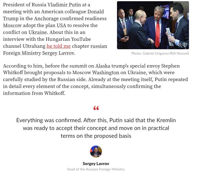 Right on cue, Lavrov announced today that, actually, Putin had agreed to the American version of terms as presented to him at Alaska … but that there’d been some regrettable confusion since then leading to further talks being “postponed”. Here: