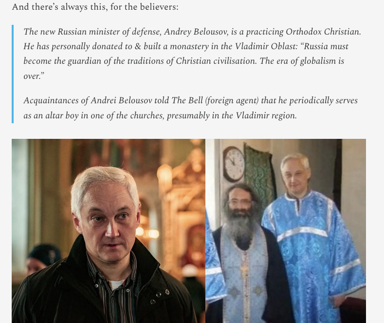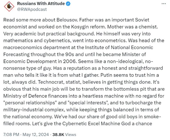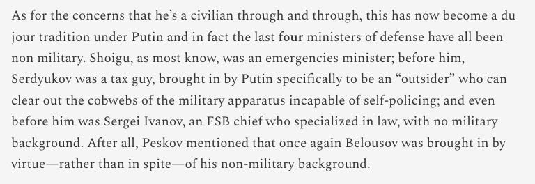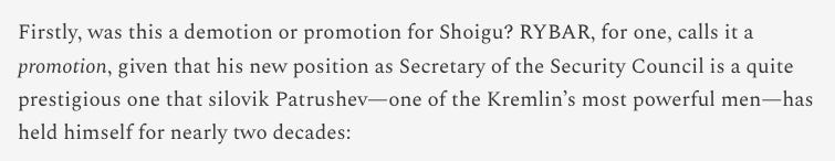 As boring as it sounds, Putin’s circles’ main concern does appear to just be to make and steal as much money as possible in Russia and Shoigu was no doubt going too far and taking too much from others. They have activated all their assets to cheer for the new appointment while making light of the shuffle by basically just not saying anything about it at all