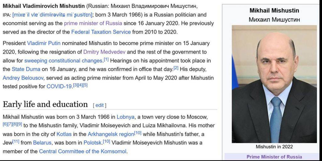 He is from the same “Bathhouse” as it were. In fact, you would be hard-pressed to find anyone in the “Russian” government who isn’t from there as well. Worse, I actually didn’t even know that Mishustin was distantly related to Nuland until yesterday, when I went to his Wikipedia profile. In fact, I didn’t even know that Shoigu was a distant cousin of Chuck Schumer until I was researching the article that I wrote about him the other day. I just assumed that, well, somebody in the government wasn’t from the Bathhouse.