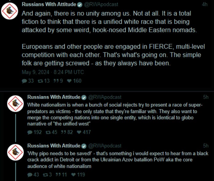 Funny enough and tangentially related to everything that we’ve been talking about so far, to commemorate May 9th, the RWA gang went on a social media posting-spree. They decided to bravely attack their fan base, which is largely comprised of a community that really does need to be taken down a peg or two in the West. They let White people who criticize a particular tribe who may or may not run their governments really have it!